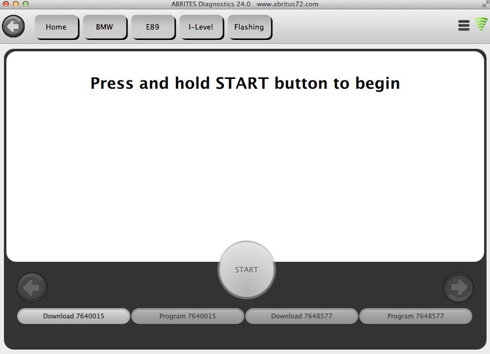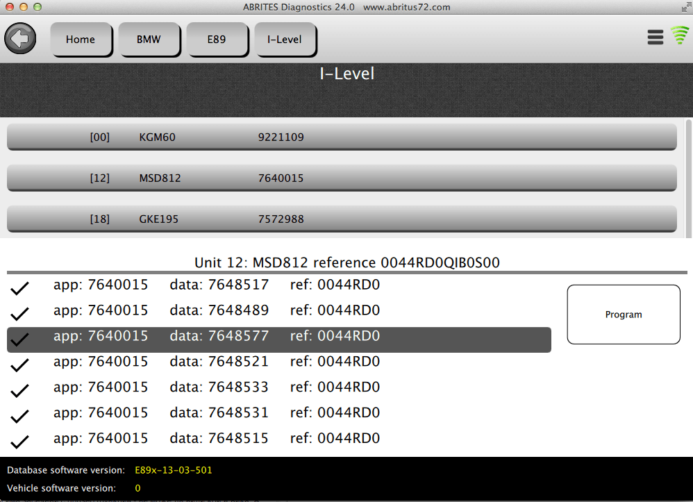 Reflashing of the firmware of the modules with newer (or older if requred) software versions. The user is presented with the firmware versions of each module and is given suggestions of what is the most proper version of each module. What distinguishes that function from what the original software tool provides is the ability to choose arbitrary flash version. The user can either accept or ignore the flash version suggestions and apply whatever operation they think is necessary to the module. This gives great flexibility and can solve problems that even the dealer tool could not tackle. For example finding the best data flash of motor computers – abrites programming function allows experimenting to flash every data flash that the user chooses to try, instead of firmly limiting the user to one specific option.